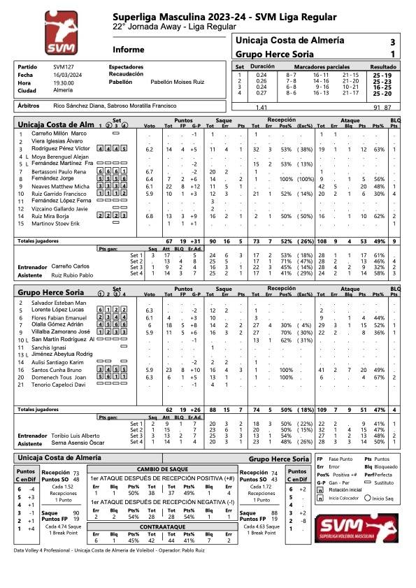 Unicaja Costa de Almería y Grupo Duero Soria se jugaron todo a una carta, la del triunfo, para ser el primer equipo de los terrestres ... en la Superliga Masculina y ganó el que mejor hizo las cosas, pero todo en un partido mayúsculo en espectáculo que sonrió al equipo almeriense. Éste cuajó mejor los tramos importantes, que no siempre son los finales. Al voley se empieza a defender en cuanto el balón se pone en movimiento. Ahí, el equipo almeriense, con una gran dirección de equipo por parte de Bertassoni, ladeó la defensa soriana. No interpretó lo que propuso Unicaja y la victoria en los dos primeros sets le puso el trabajo cuesta arriba.