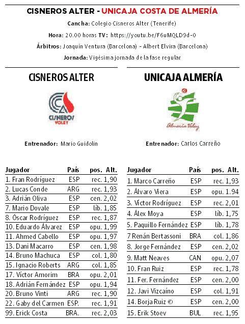 La situación actual invita a no olvidar que precisamente Cisneros Alter podría ser el rival en los cuartos de final por el título en muchas de las variantes posibles, sobre todo si hay un triunfo ahorrador hoy sábado desde las ocho, hora peninsular. Para lograrlo habrá que rayar la perfección frente a una grada seguramente llena, en medio de un gran ambiente de voleibol. Y es que si la Copa ha dado mucho a Unicaja Costa de Almería, no menos ha otorgado a los tinerfeños, que han cuajado un torneo excelente y que, además de sus propios intereses en fase regular, van a ser los jueces de la segunda posición, toda vez que la siguiente jornada, penúltima, visitan a Grupo Herce Soria en Los Pajaritos. Queda todo por escribir.