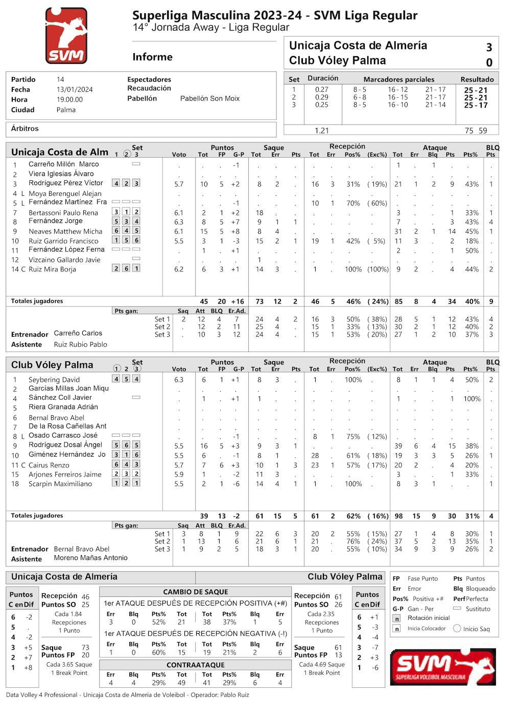 Y el equipo almeriense, otra vez con el buen saque, propició tranquilidad en la forma de encajar las acciones de ataque, con acierto en ataque y en lectura para que Palma no fuese capaz de encontrar el lugar por el que hacer daño. Tras un nuevo error de Ángel Rodríguez, Abel Bernal detuvo el set (11-18), que fue un 'seguro' para encarar la recta final con una ventaja sólida (12-20), tras un ataque de Fran Ruiz. Aunque Ángel Rodríguez trató de maquillar, Unicaja Costa de Almería estuvo firme en su trabajo en bloqueo de continuidad y en acierto en contraataque para ir acercando la victoria. La misma llegó con un punto de Fernando Fernández que concede a los almerienses una victoria ganada a pulso.