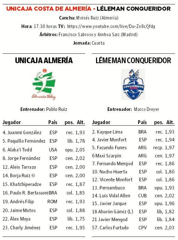 Como ya se ha apuntado en otras ocasiones, Unicaja Costa de Almería cogerá durante toda la fase regular a quien deja Guaguas, el único invicto que queda, arma de doble filo siempre. Eso sí, en este caso da igual porque la entidad del adversario es mayúscula y su motivación siempre es altísima. UPV Léleman Conqueridor se ha hecho para levantar algún título esta temporada, su cuarta en la máxima categoría, y lo deja bien claro punto tras punto, con hambre. Por lo tanto, será un durísimo hueso que roer para los blanquiverdes en otra prueba de fuego, la segunda consecutiva tras recibir a Melilla, para su Moisés Ruiz.
