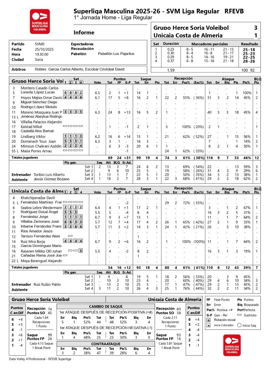 El partido arrancó como un naufragio para Unicaja Costa de Almería, arrastrado por la precisión y contundencia de Soria. Desde los primeros puntos, los almerienses ... se vieron superados en saque y ataque, con errores que permitieron a los sorianos marcar el ritmo y abrir ventaja. Pepe Villalba, Bernardo Westermann y Jorge Fernández intentaban recomponer la situación, pero cada acierto soriano se sentía como una ola que los empujaba hacia atrás, haciendo que los dos primeros sets fueran un tormentoso viaje.