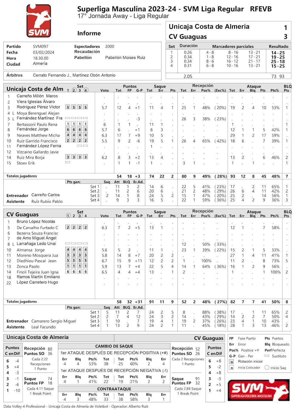 No hubo cambios. Guaguas fue muy superior con sólo un par de fundamentos, el saque y el bloqueo. Se basó en Juan Pablo Moreno para sacar a Unicaja del partido. Con 1-5, Carreño puso 'pie a tierra' y no cambió la solvencia atacante de Guaguas. Salvo porque era imposible mantener ese ritmo y comenzó a errar (5-8), con tiempo de Camarero, dando vida a un equipo almeriense que se metió gracias a un gran ataque de Fran Ruiz (8-9). Pero no hubo aguante. El saque de Jean Pascal Diedhiou terminó por desestabilizar a Unicaja, que paró el set (8-11).