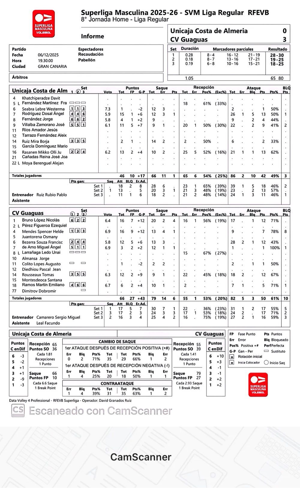 No hubo reacción blanquiverde, cada vez más fuera, con los amarillos cada vez más dentro. Fue desarrollándose el partido con idéntica sinergia. Guaguas anotaba fácil y Unicaja Costa de Almería sufría de lo lindo para acabar la última manga del partido de una forma digna. El riesgo no se transformó en crecimiento, sino en la separación de 'poderes', reflejándose en un marcador cada vez más ampliado (18-11). Hubo momentos tímidos de aparecer con el saque de Westermann, pero el trabajo en defensa no terminó de cuajar (23-15). Un error al saque de Räsänen puso la bola de partido (24-16). Evitado por dos acciones, Colito cerró el partido que certifica el peor momento en la historia blanquiverde, excluyendo aquel primer año.