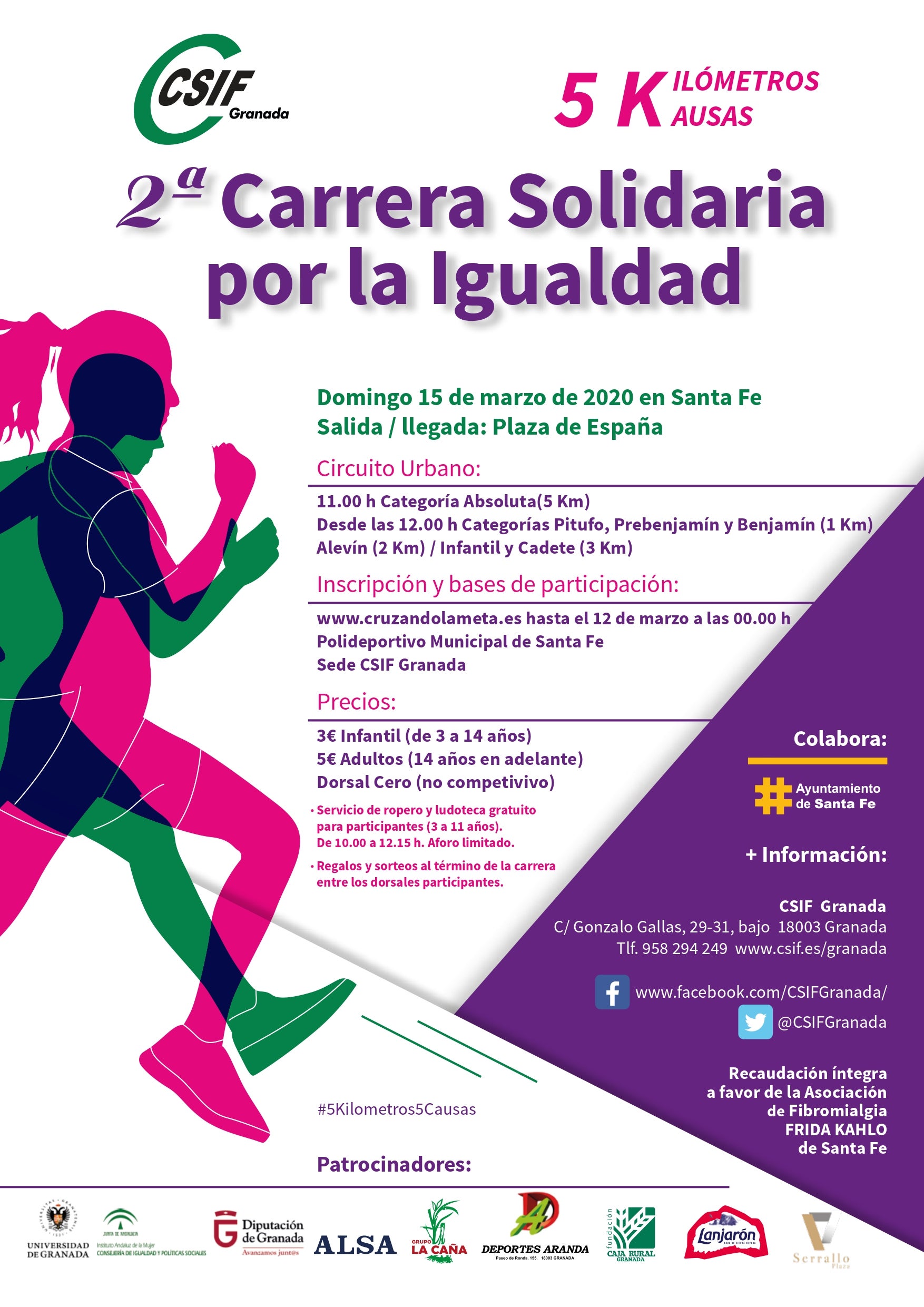El domingo 15 de marzo también se celebrará la II Carrera Solidaria por la Igualdad '5 kilómetros 5 causas' organizada por el sindicato CSIF Granada en Santa Fe con la colaboración del Ayuntamiento local. La salida se dará a las 11 horas desde la Plaza de España. El día anterior se celebrará la Pequemontañera.