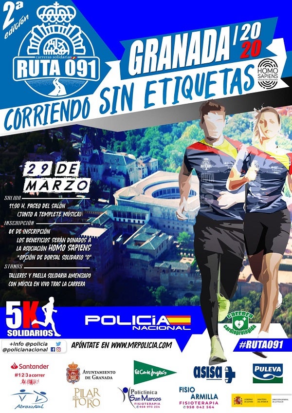 El domingo 29 de marzo tendrá lugar en la capital la II Carrera Solidaria Ruta 091, bajo el lema 'Corriendo sin Etiquetas'. Se trata de una iniciativa de Policía Nacional a lo largo de todo el país, con hasta una veintena de pruebas. Beneficios a favor de la asociación Homo Sapiens. Salida a las 11 horas desde el Paseo del Salón.