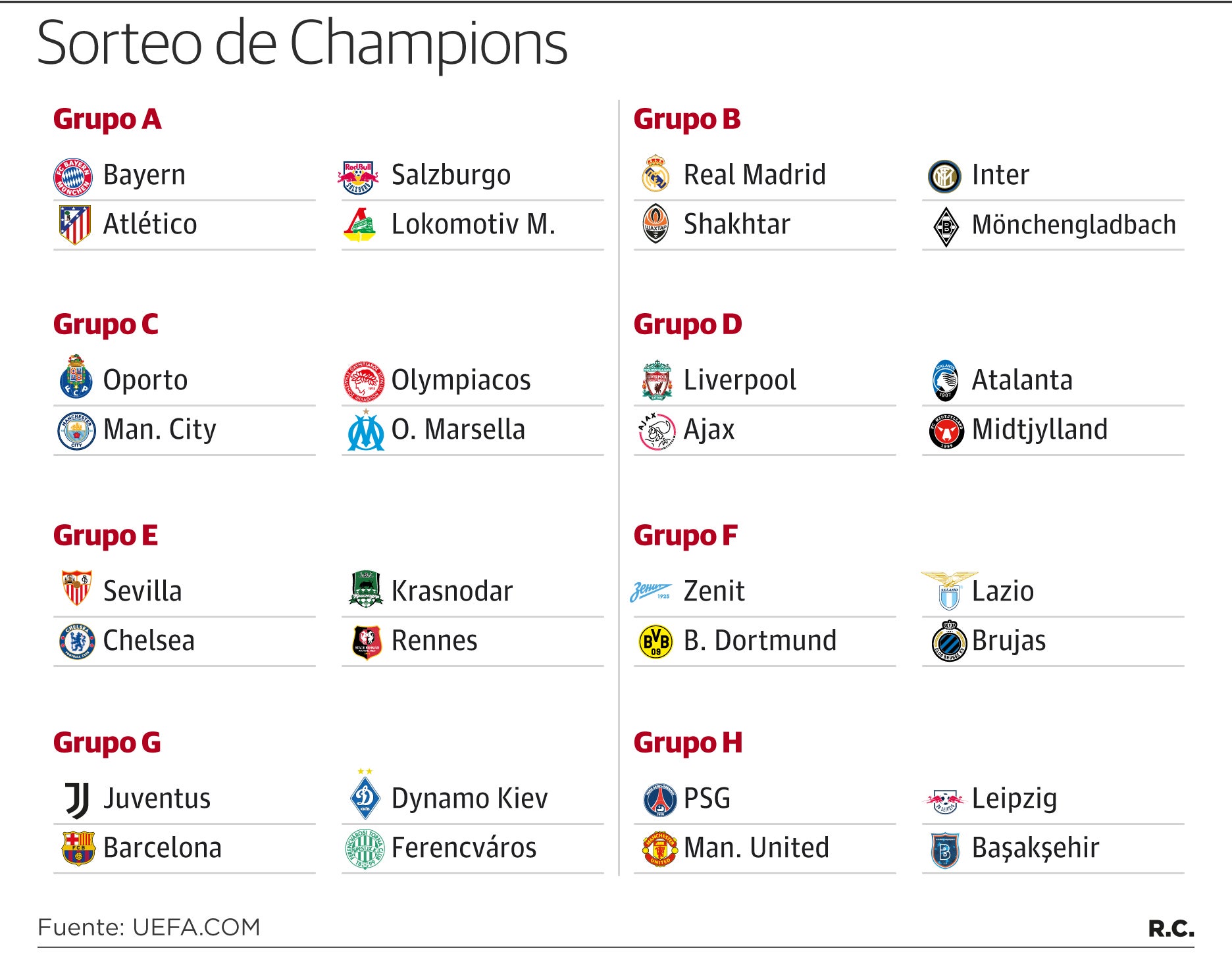 Los blancos se medirán a Shakhtar, Inter y Borussia Monchengladbach; los azulgranas a Juve, Dinamo de Kiev y Ferencváros; los colchoneros a Bayern, Salzburgo y Lokomotiv; y el Sevilla, a Chelsea, Krasnodar y Rennes