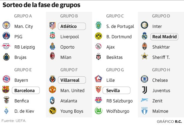 La lotería deparó un grupo equilibrado al Sevilla, que se medirá al Lille, actual campeón de la liga francesa, al Salzburgo austríaco y al Wolfsburgo germano. Por su parte el Villarreal, que accedió a la Champions tras ganar la primera Europa League de su historia, reeditará esa final contra el Manchester United, ya que la fortuna encuadró al equipo de Unai Emery en el mismo grupo que los 'diablos rojos'. El 'submarino amarillo' se cruzará además con el trepidante Atalanta y el Young Boys suizo.