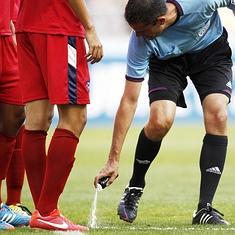 Un árbitro marca con un spray la línea en la que debe colocarse la barrera.
