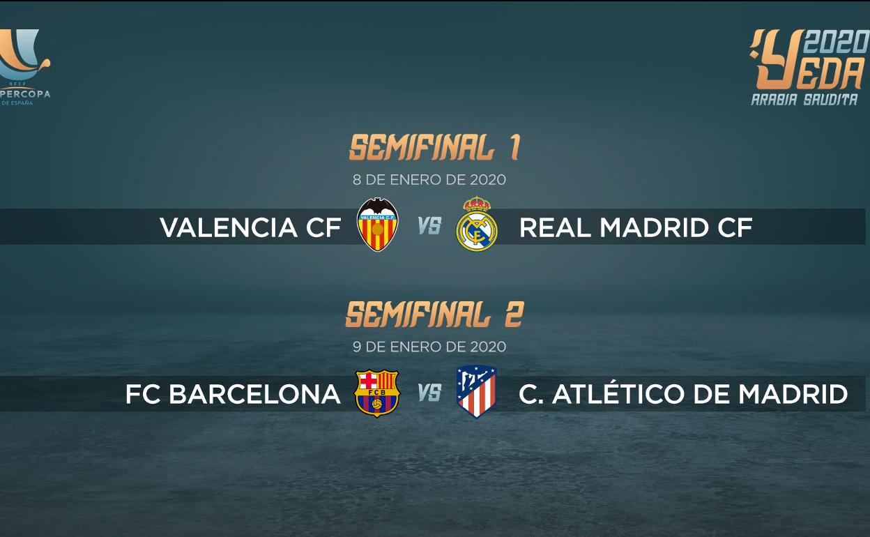 Valencia y Real Madrid por un lado, y Barça y Atlético de Madrid por otro, se medirán en las semifinales de la Supercopa ... de España, que estrena formato de final a cuatro y sede, pues se disputará en Yeda, Arabia Saudí. Valencianistas y madridistas se enfrentarán el miércoles 8 de enero y azulgranas y colchoneros un día después, mientras que la final tendrá lugar el domingo 12.