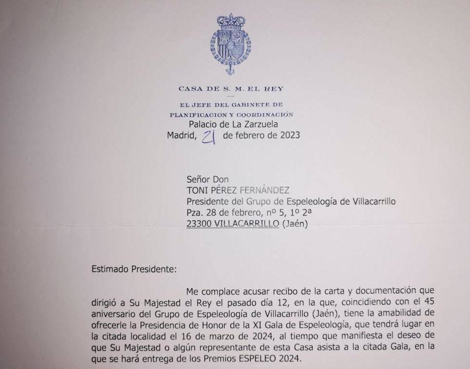 En la misiva, dirigida al presidente del GEV, Toni Pérez, la Casa de Su Majestad El Rey da acuse de recibo a la carta y documentación que desde el club se le remitió el día 12 en el que se le ofrece «la Presidencia de Honor de la XI Gala de Espeleología» que tendrá lugar el 16 de marzo de 2024 en Villacarrillo, «al tiempo que manifiesta el deseo de que Su Majestad o algún representante de esta Casa asista a la citada gala en la que se hará entrega de los premios ESPELEO 2024».