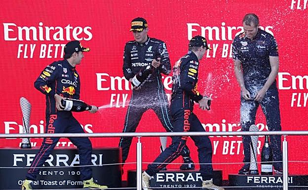 Max Verstappen celebra la victoria en Bakú subido a su Red Bull. EP