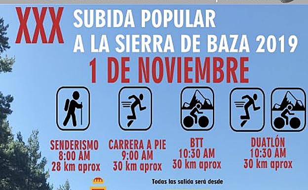El Parque Natural de la Sierra de Baza y su paraje de los Prados del Rey se convierten este 1 de noviembre en el escenario de la ya tradicional Subida a la Sierra de Baza con las modalidades de senderismo (28km), carrera a pie (30km), duatlón (30km) y bici de montaña (30km), con salidas a las 8h, 9h y 10:30h respectivamente desde el establecimiento coorganizador Intercross en la avenida José de la Mora. La prueba de duatlón se dividirá en 20 primeros kilómetros hasta el área recreativa de la Canaleja en bicicleta y diez restantes corriendo por la misma pista forestal hasta los Prados del Rey.