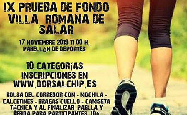 La localidad granadina de Salar albergará el próximo domingo 17 de noviembre la novena edición de su prueba de fondo 'Villa Romana de Salar', con salida a las 11 horas desde el Pabellón de Deportes. Hasta diez categorías disponibles, con bolsa del corredor que incluye mochila, calcetines, bragas para el cuello y camiseta técnica. A su finalización habrá paella y bebida para los participantes. Cupo máximo de 1.000 corredores, sin incluir a los locales. Avituallamiento líquido en el kilómetro 5 y ducha al final del recorrido.