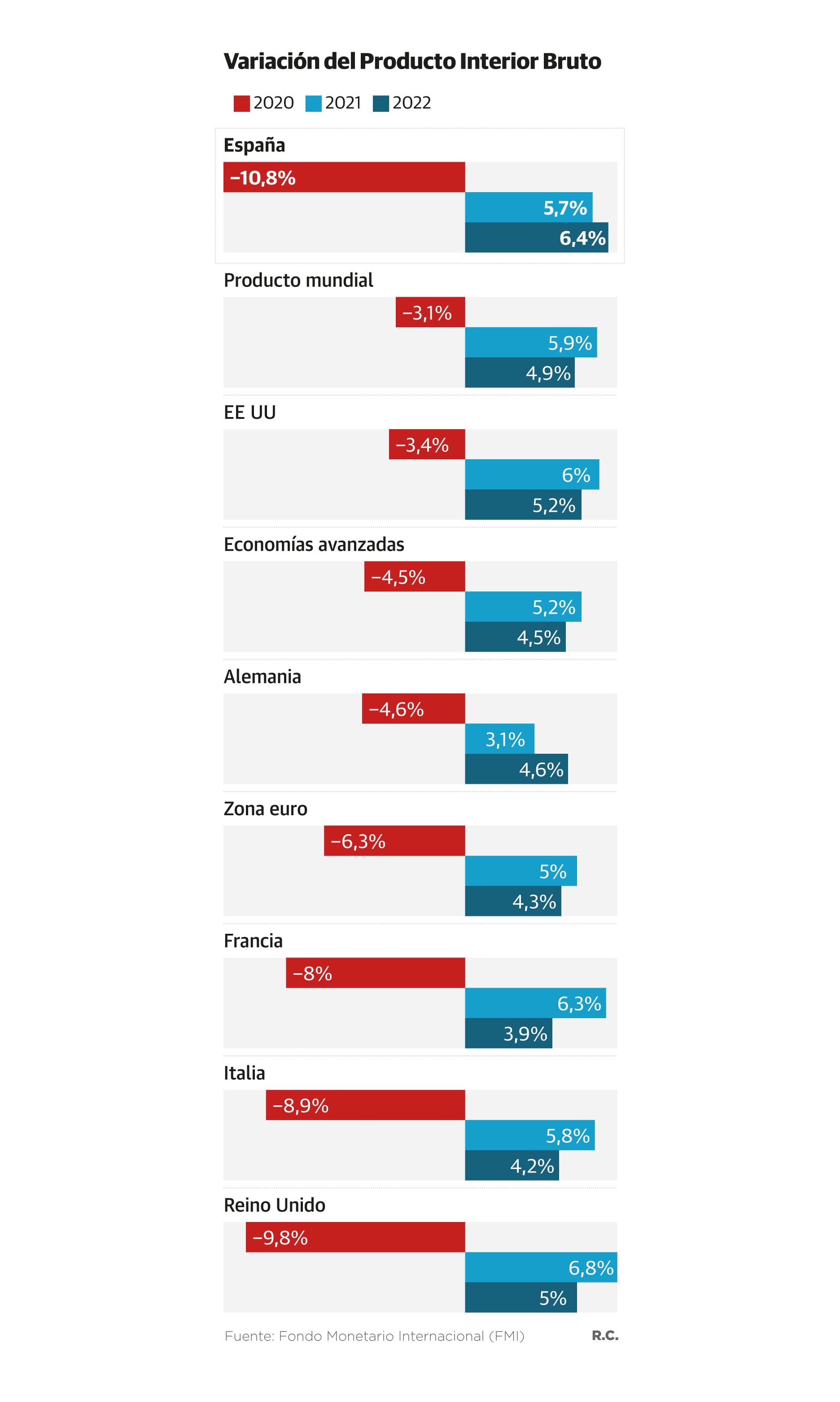 Con estas perspectivas, las esperanzas se centran en 2022. Las previsiones respecto a este año en concreto se han revisado al alza y España liderará, de forma más clara, el crecimiento y recortará distancias con otros países. De hecho, incluso se podrá superar a otros estados del entorno como Italia.