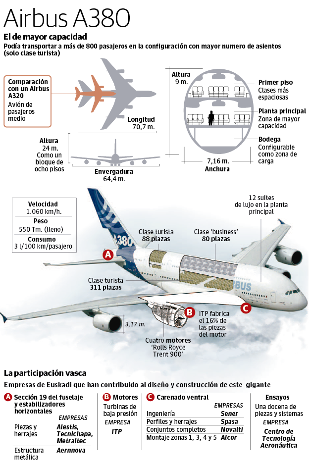 El A380, que empezó a fabricarse hace 12 años, es el avión de línea más grande del mundo. Con sus 800 plazas (en el modelo de cabina más abigarrado), Airbus buscaba descongestionar los grandes aeropuertos del mundo. Pero su gran tamaño ha sido también su mayor debilidad. Mientras la mayoría de las aeronaves en el mercado cuentan con dos motores, el A380 tiene cuatro, lo que supone el doble de posibilidades de sufrir una avería. También consume mucho más queroseno que el resto de modelos en un momento en que se busca la economía de combustible. Su gran envergadura le hace imposible operar en muchos aeropuertos, y los que sí lo acogen han tenido que adaptar sus instalaciones.