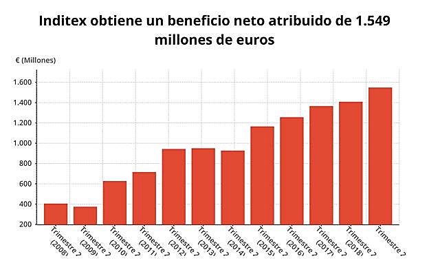 Inditex sigue batiendo récords y alcanzó su «techo histórico» de ventas, beneficio y posición de caja en el primer semestre de su ejercicio fiscal (que ... va del 1 de febrero hasta el 31 de julio), unos datos que no satisfacen a los inversores, ya que su precio en Bolsa cayó con fuerza. Así, el beneficio neto del grupo fundado por Amancio Ortega se elevó hasta los 1.549 millones de euros, lo que supone un 10% más que en el primer semestre de 2018, aunque se rebajaría a un 7% si se recoge el impacto de la Normativa NIIF 16 sobre los alquileres, según ha informado hoy la compañía.