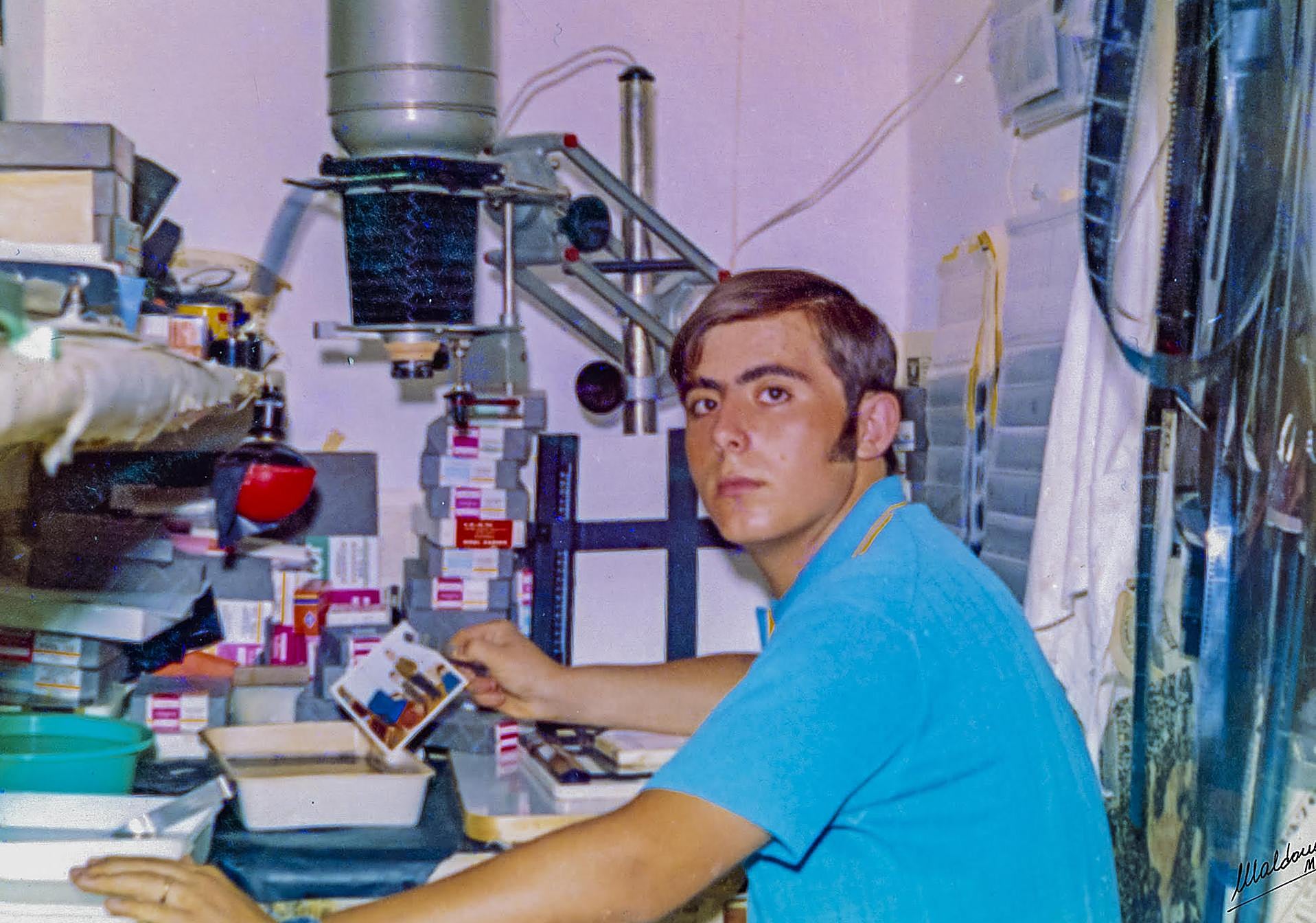 Ha conocido todos los procesos en aquellos años 1967, 1968, 1970 donde empezó con una cámara analógica llamada Nerasport, que usaba película de negativo 4,5x6. Más tarde, cuando montó su estudio en la calle Ancha de Motril, empezó a usar una cámara con placas 13x18, todo revelado manualmente con cubetas de químicos propios, revelador, baño de paro y fijador, ampliando poco a poco con placas más tarde para producir fotografías de gran tamaño.