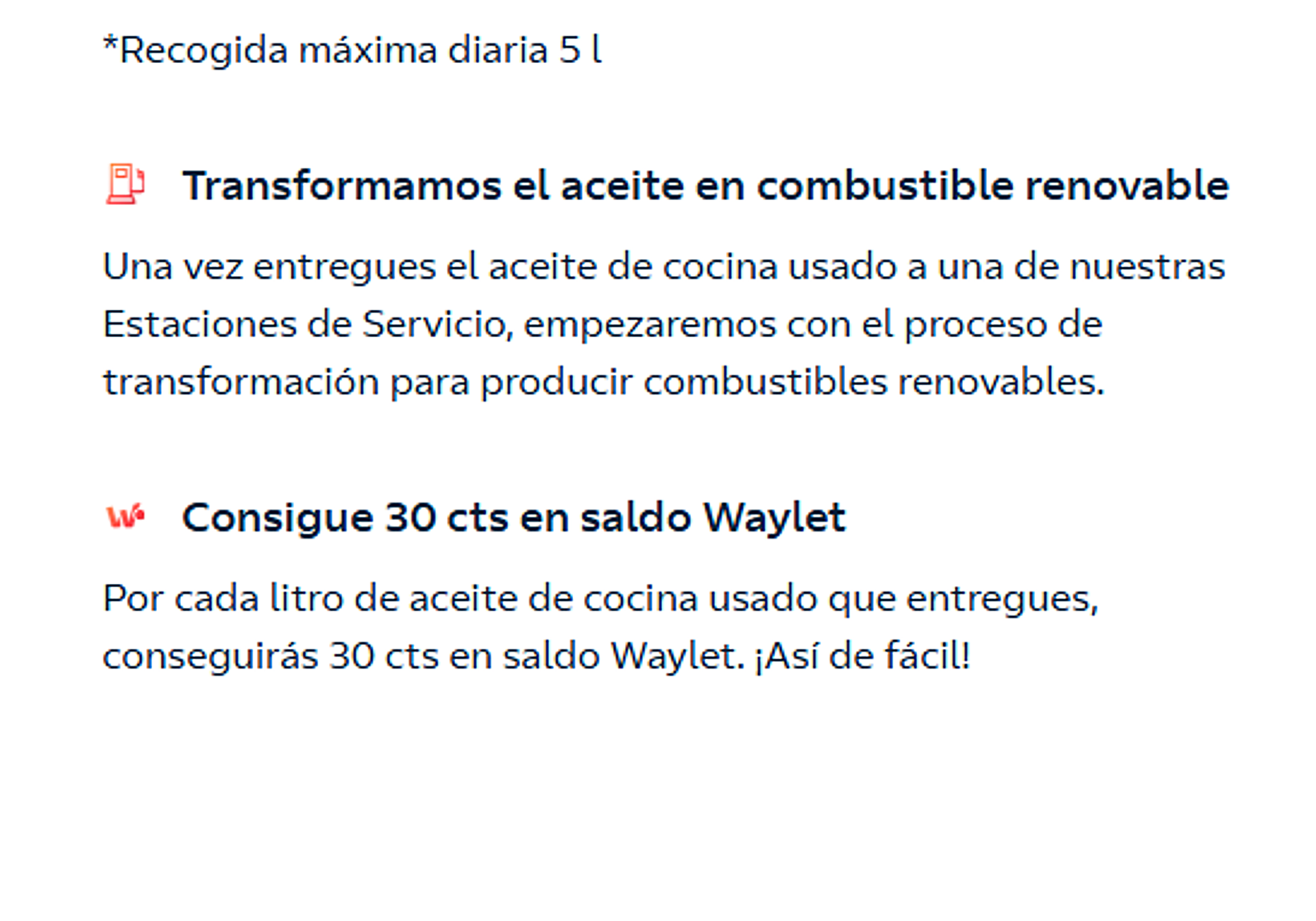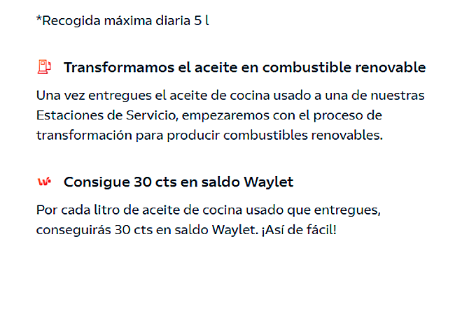 En la gasolinera un vendedor será el encargado de recoger el aceite y, una vez entregado, otorgará una cantidad de saldo a través de la aplicación Waylet. En concreto, por cada litro de aceite de cocina usado que se entregue se consigue un descuento de 30 céntimos y el máximo que se puede entregar al día asciende hasta los cinco litros, lo que supondría hasta 1,50 euros de saldo.