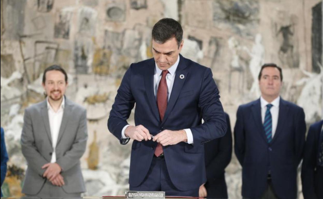 Ni siquiera ha pasado un mes desde la formación del nuevo gobierno de coalición y el presidente, Pedro Sánchez, ya ha estampado su firma en ... el primer acuerdo logrado en el ámbito del diálogo social: la subida del Salario Mínimo Interprofesional (SMI) a 950 euros al mes, algo que se antojaba cuando menos muy complicado hace poco más de diez días. Al Ejecutivo le interesa exhibirlo como un gran éxito de los muchos que vendrán por delante en esta legislatura y por ello este acto, con el que también se abrió formalmente el diálogo social, contó con un protocolo muy estudiado en el que participaron, además del jefe del Ejecutivo, la vicepresidenta de Asuntos Económicos, Nadia Calviño; el vicepresidente de Derechos Sociales, Pablo Iglesias, y la ministra de Trabajo, Yolanda Díaz. Por parte de los agentes sociales, acudieron los secretarios generales de UGT y CC OO, Pepe Álvarez y Unai Sordo, respectivamente, y los presidentes de las patronales CEOE y Cepyme, Antonio Garamendi y Gerardo Cuerva, respectivamente.