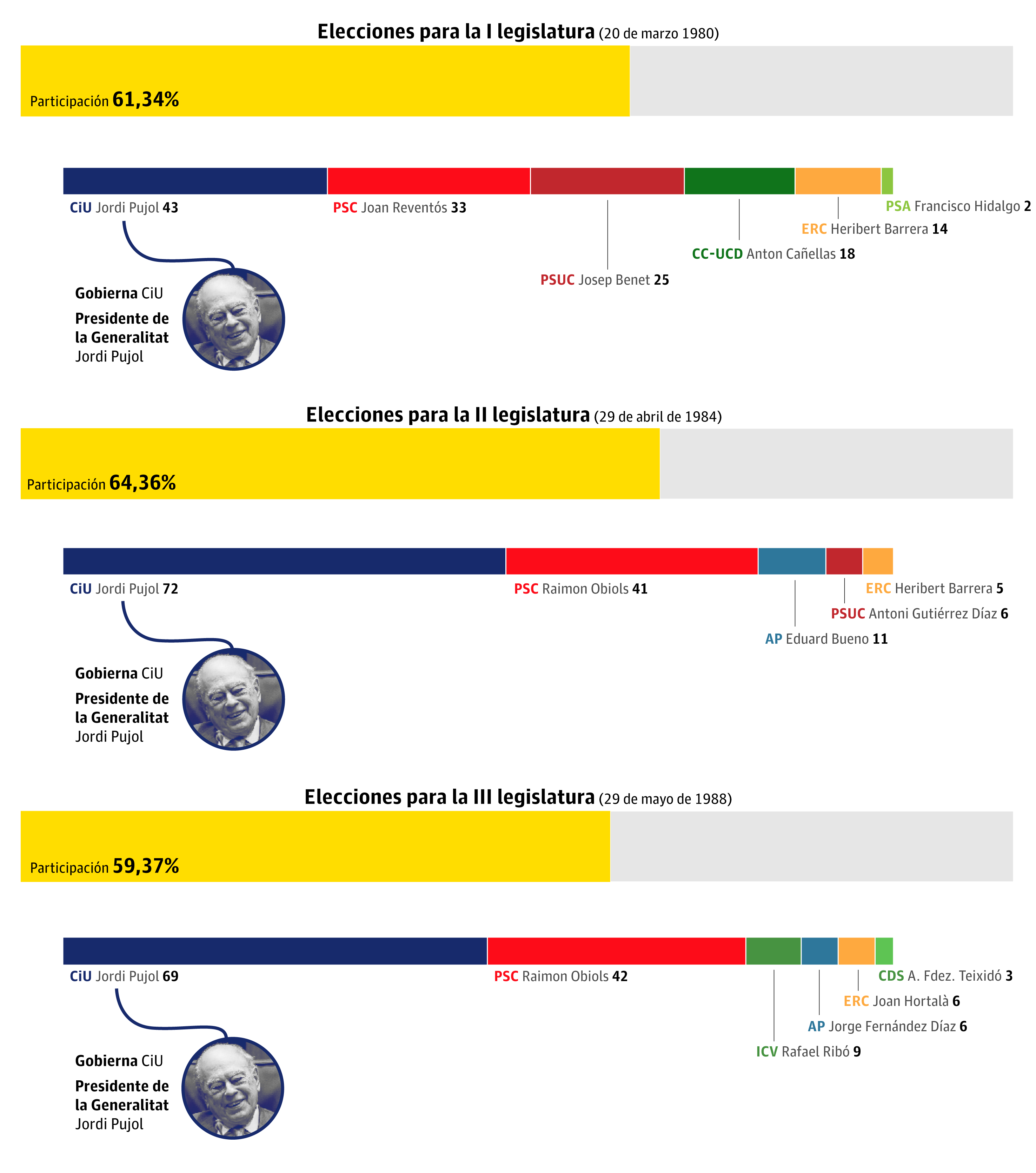 Durante los años 80, con la autonomía recién adquirida para Cataluña, los comicios se caracterizaron por una participación que siempre rondó el 60%. Fueron los años de las grandes mayorías de CiU y su líder Jordi Pujol.