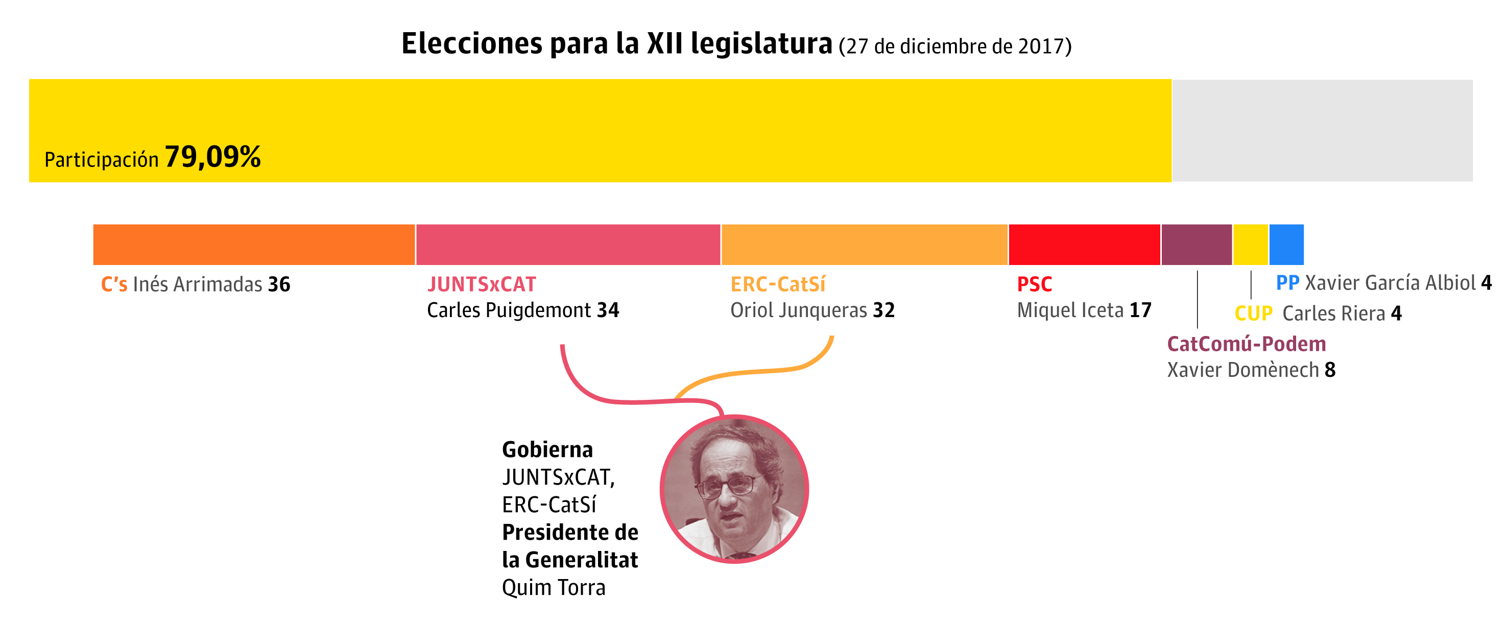 Aunque el récord de participación no llegaría hasta el 27 de diciembre de 2017, casi tres meses después del referéndum del 1 de octubre. En aquella ocasión acudió a ejercer el derecho de sufragio el 79,09% del censo y la candidata más votada fue Inés Arrimadas, de Ciudadanos, aunque posteriormente no lograría formar gobierno, como si pudo hacerlo Quim Torra, de JxCat, junto a ERC.