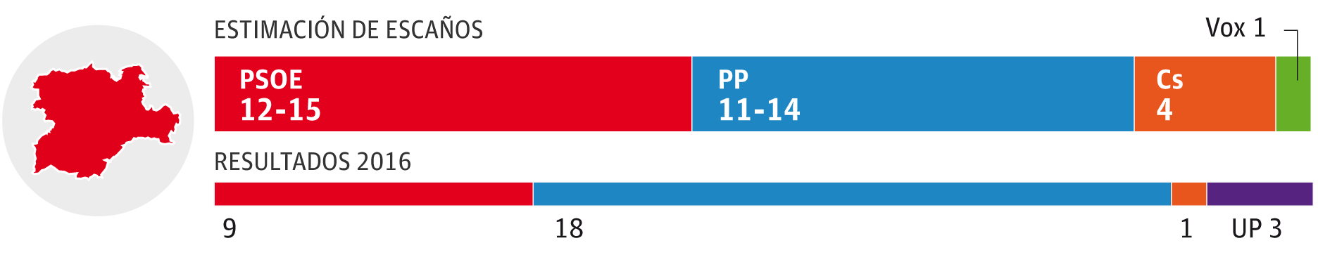 El PSOE ganaría con claridad y obtendría entre dos y tres escaños, por delante de una coalición de PP y Foro que se movería entre uno y dos y del resto de formaciones en liza, que lograrían un parlamentario cada una: Ciudadanos, Podemos y Vox. La encuesta pronostica que un escaño 'baila' entre el PSOE y PP-Foro. En porcentaje, los socialistas superan en once puntos a la coalición de la derecha.