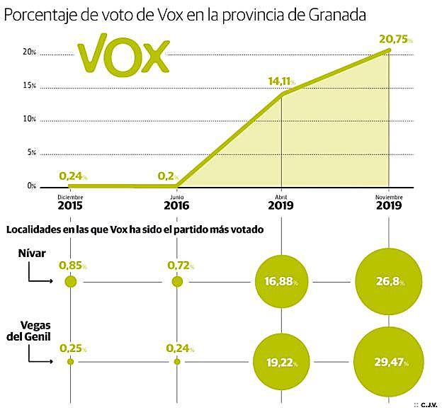 Los casos de Nívar y Vegas del Genil son sólo dos ejemplos del estirón de Vox en la provincia. En Castril, el partido dobla en puntos porcentuales al PP (32,9% frente al 15,2% de los de Casado). En Arenas del Rey también pasa por encima del PP, con un 28,7 frente al 20,3%.