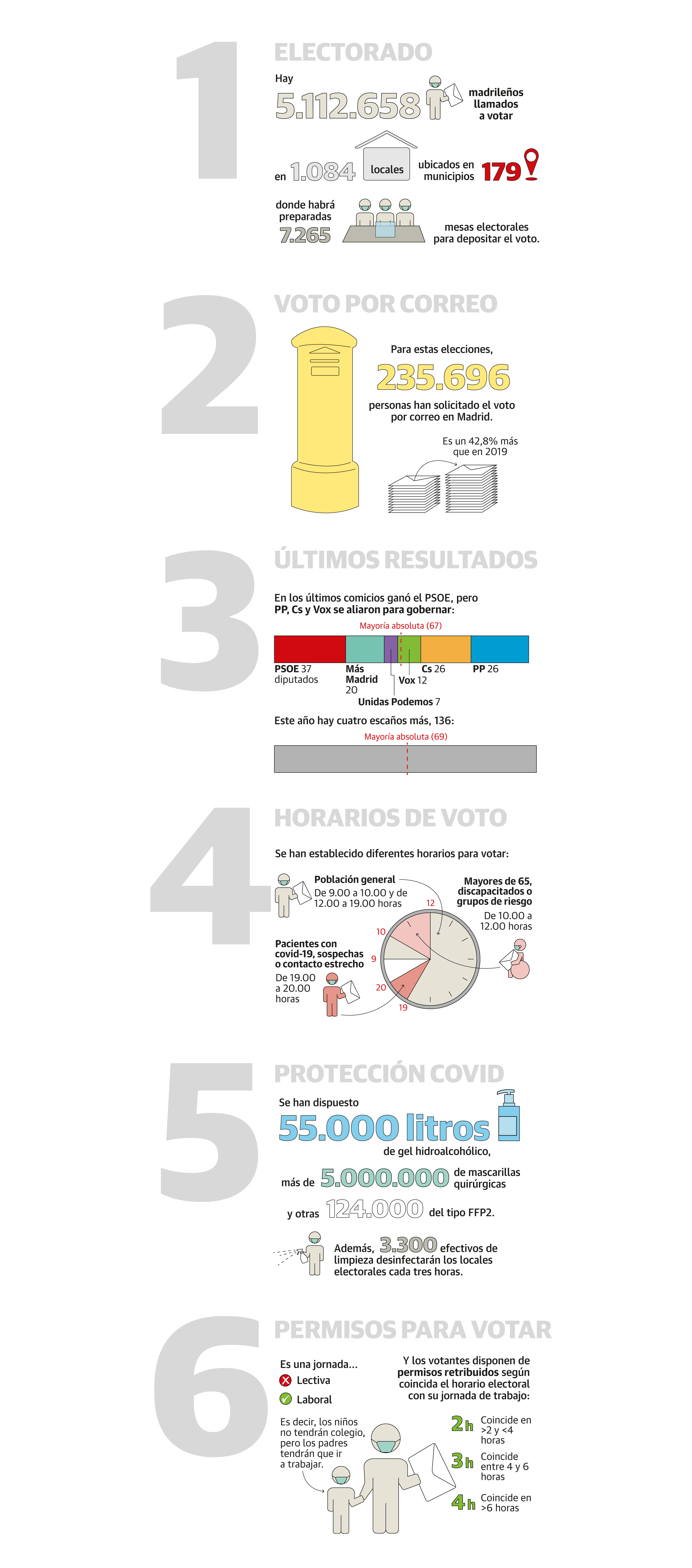 Tan solo dos años después, la Comunidad de Madrid vuelve a celebrar unas elecciones autonómicas. La presidenta regional del PP, Isabel Díaz Ayuso, decidió romper la alianza que mantenía con Ciudadanos el pasado marzo y ahora parte como la rival a batir. Están llamados a las urnas más de cinco millones de votantes que, como ocurrió en Cataluña el pasado febrero, ejercen su derecho al sufragio en medio de la pandemia. La covid-19 está muy presente en unas elecciones que, por fuerza mayor, no son unas más a causa del coronavirus.