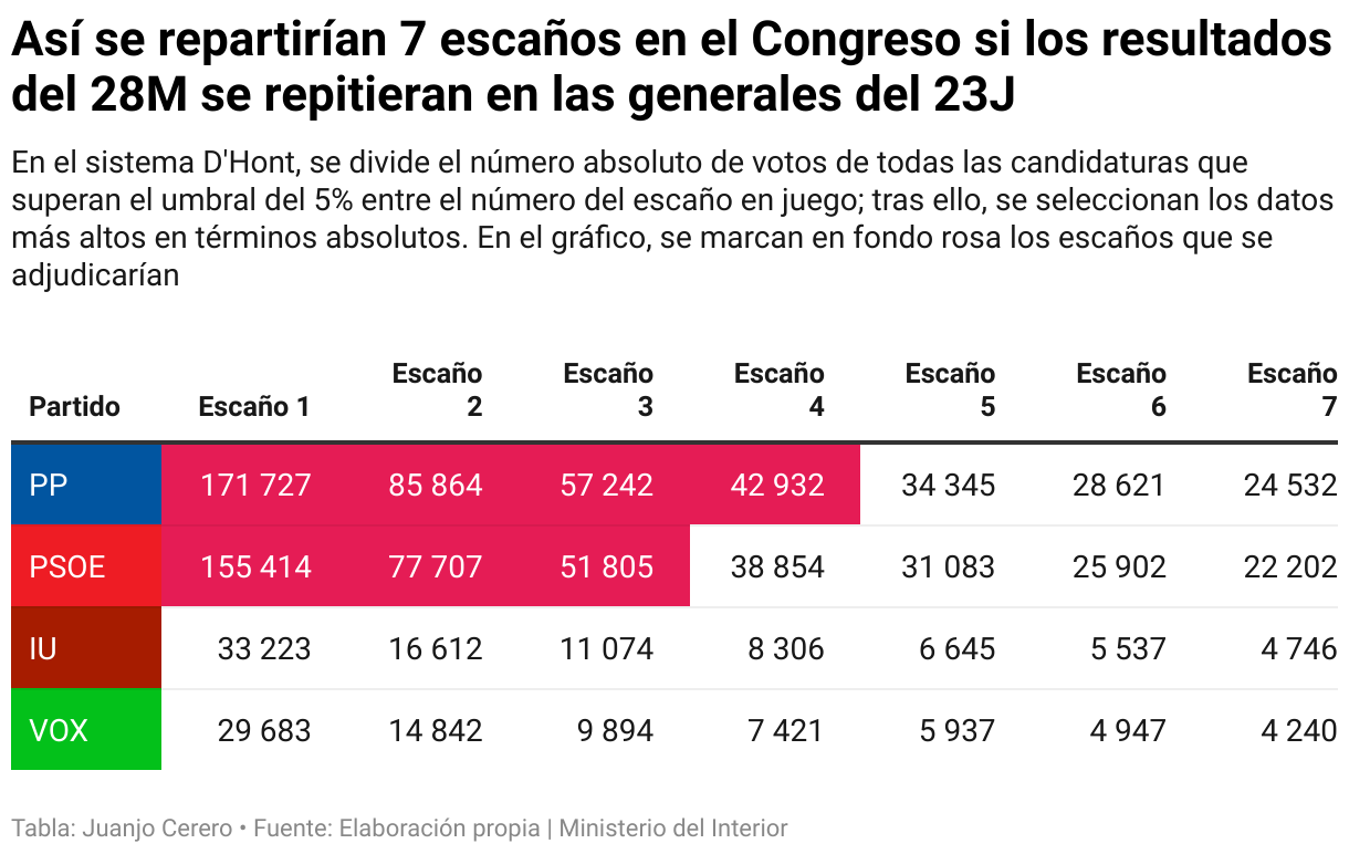 Teniendo en cuenta los votos de los 450.631 granadinos con derecho a voto que han participado en estos últimos comicios del 28 de mayo, y que la provincia de Granada tiene una representación de siete escaños en el Congreso de los Diputados, el Partido Popular refrendaría el respaldo con cuatro escaños y 4.078 votos más que su inmediato perseguidor, el Partido Socialista, que obtendría tres escaños.