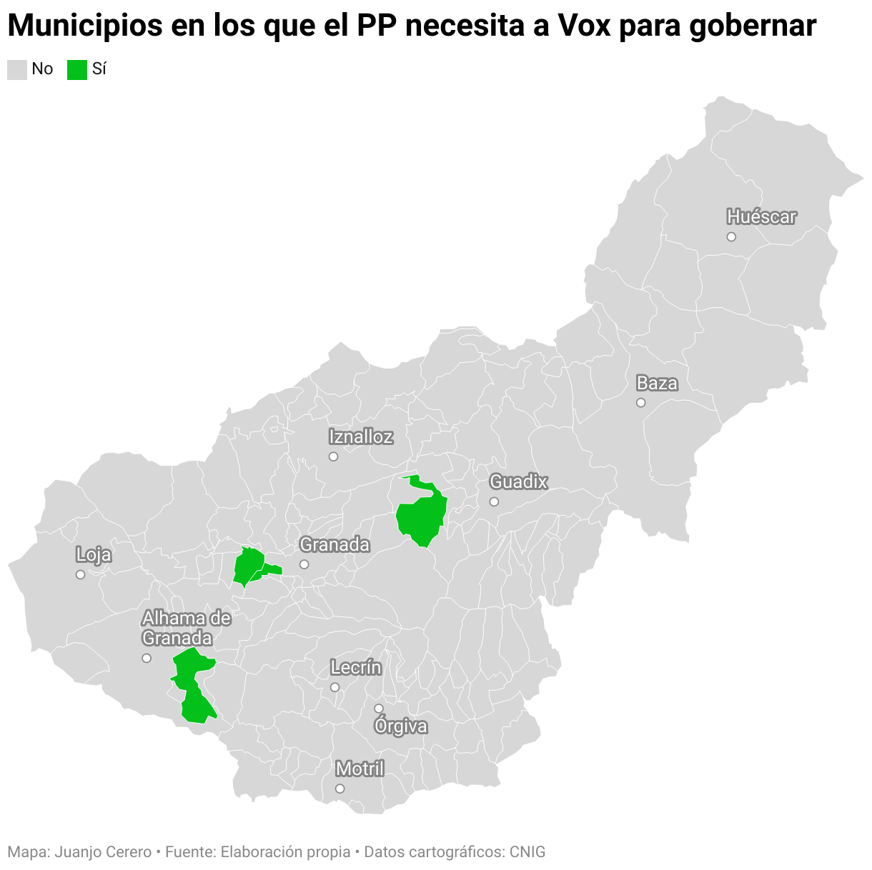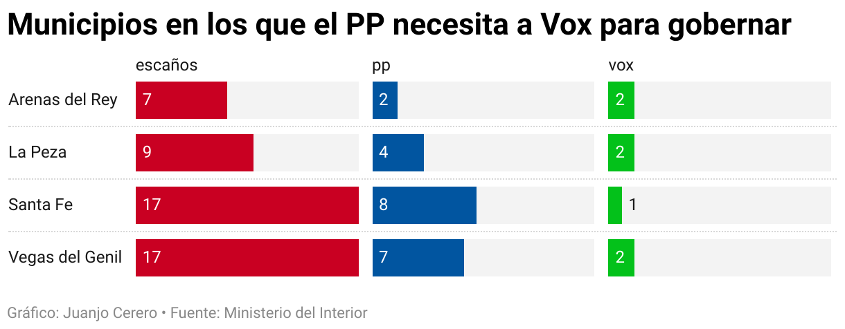 La irrupción o el ascenso de Vox en varios municipios convierte a la formación en clave para formar gobierno. En cuatro municipios puede ser la llave de entrada del Partido Popular. Hay dos de ellos de más de 10.000 habitantes en los que Vox y PP deben ponerse de acuerdo si quieren que la derecha gobierne. Son Vegas del Genil y Santa Fe. En el primer caso, los siete escaños populares y los dos de Vox serían suficientes sobre una mayoría absoluta de 9 concejales. Situación similar a la del ayuntamiento santaferino, con 8-2 para PP y Vox.