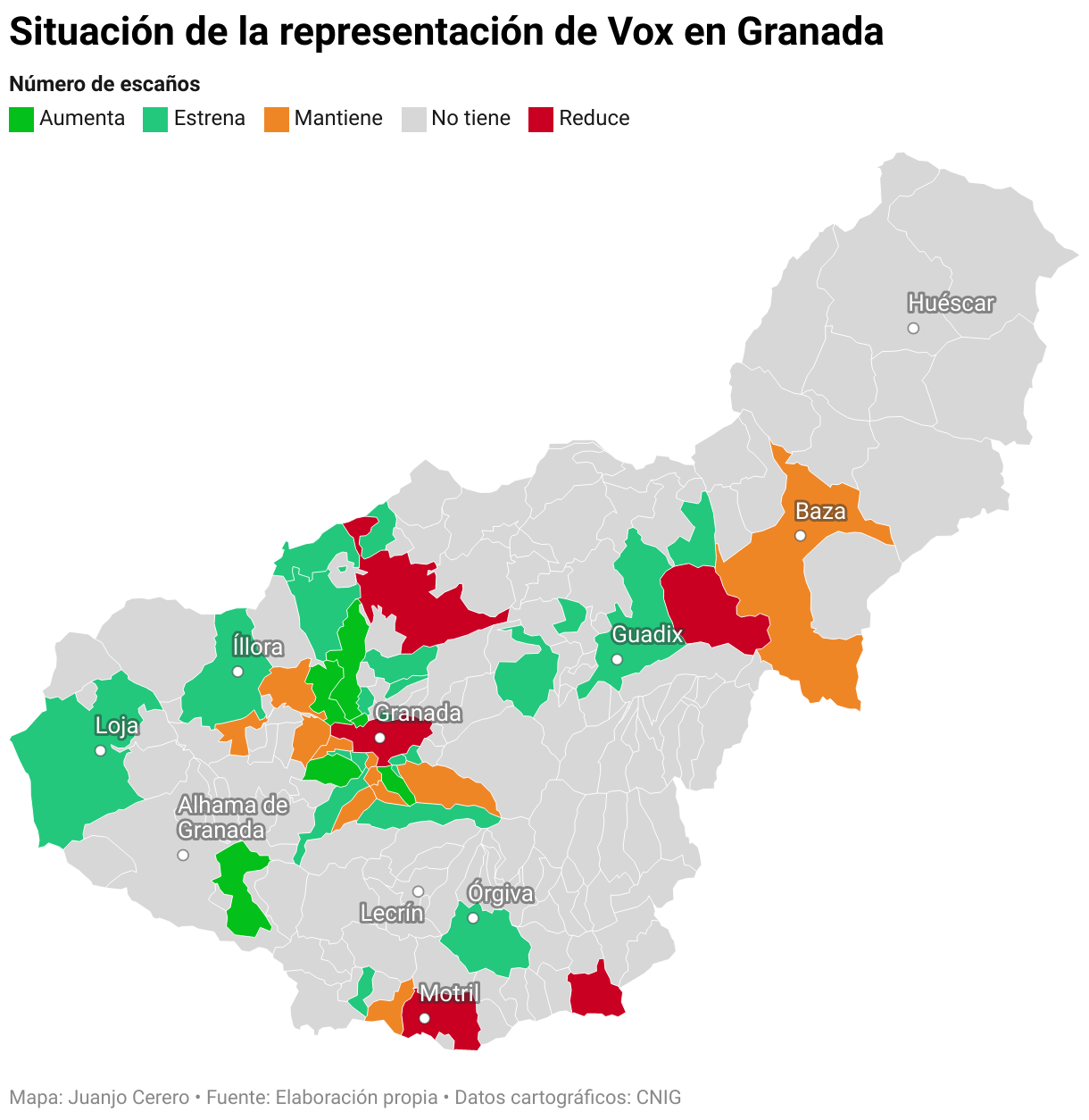 Pueblos con peso en la provincia como Guadix, Huétor Vega, Loja, Órgiva o Peligros también contarán con un representante de la formación verde durante la próxima legislatura. El resto de municipios que completa la lista en la que Vox entra por primera vez son: Alhendín, Cájar, Campotéjar, Cenes de la Vega, Cogollos Vega, Colomera, Cúllar Vega, Dílar, Ítrabo, Jun, Montillana y Nívar.