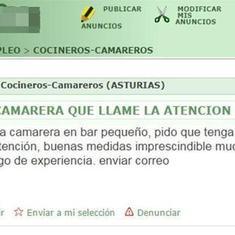 Hace unos días se mostraba una recopilación de ofertas de trabajo de lo más extrañas, pero parece ser que la lista sigue aumentando. Las páginas ... para buscar trabajo son unas de las más visitadas, pero a veces sorpresas como estas aparecen. Esta vez se trata de la búsqueda de una camarera para trabajar en Asturias.