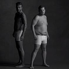 David Beckham no está solo. Le acompaña su amigo el actor James Corden. Ambos lucen palmito sin complejos con las obvias diferencias entre el modelo y el animador en una producción para el programa de este último 'The late late show'.