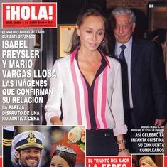 No, no es miércoles. Es lunes. Pero la revista ¡Hola! ya está en el quiosco. Y no, no se ha adelantado por la boda real ... sueca, que también, sino porque la portada muestra a la pareja del momento: Isabel Preysler y Mario Vargas Llosa. Otra vez. Pero en esta ocasión dando la cara. Hace cinco días, el miércoles pasado, aparecían de espalda, dejando intuir que iban de la mano, pero hasta ahí. Eso sí, provocó un seísmo de grado máximo, sobre todo por el lado de la familia del Premio Nobel. Y no es de extrañar si es cierto, como mantiene Patricia Llosa de Vargas, que se enteró por la portada de ¡Hola! que era una mujer separada.