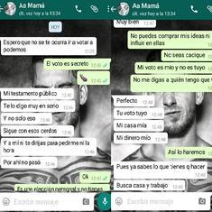 El tuitero @mnavarro_93 revela estas capturas de Whatsapp: "Sigue con esos cerdos y a mí ni te dirijas para pedirme la hora", le dice ella. "Mi voto es mío, no me digas a quién tengo que votar", le responde él, a lo que la madre concluye: "Pues ya sabes lo que tienes que hacer, busca casa y trabajo"