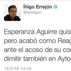 Las reacciones a la dimisión de Esperanza Aguirre como presidenta del PP de Madrid se han ido sucediendo durante el pasado fin de semana. Una ... de la más llamativas ha sido la de Íñigo Errejón, número dos de Podemos y doctor en Ciencias Políticas, que comparó la marcha de Aguirre con la de Reagan «acorralada por la corrupción».