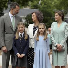 Todos ellos han posado ante los medios de comunicación unos minutos antes de entrar en la parroquia. La infanta Sofía, vestida con el uniforme de su colegio privado, ha respondido con una sonrisa y casi encogiéndose de hombros cuando la prensa le ha preguntado si estaba nerviosa por recibir la Primera Comunión. A su lado su hermana, la Princesa de Asturias, respondía por ella asintiendo con la cabeza.
