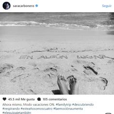 La periodista, según recoge 'Chance', no ha dejado pasar la oportunidad de contar en las redes sociales que hoy su hijo Lucas cumple un añito. Para ello ha publicado en Instagram una fotografía de sus pies en la playa, donde había dibujado: «En algún lugar». Una imagen a la que añadía el mensaje: «Ahora mismo. Modo vacaciones ON».