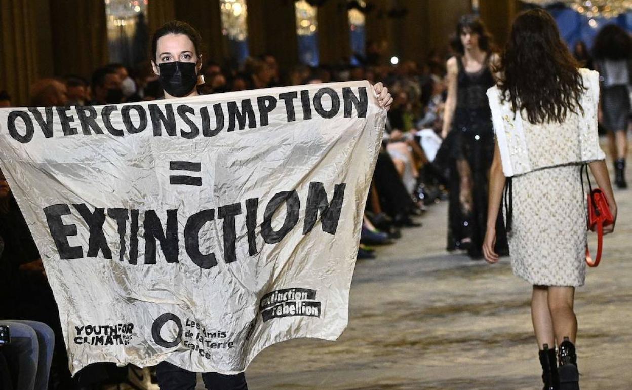 Miembros del grupo ecologista Extinción Rebelión irrumpieron este martes en el desfile de la casa de moda Louis Vuitton en el Louvre para denunciar el ... impacto de la industria de la moda en el cambio climático, en el último día de la Fashion Week de París. Con una gran pancartae que decía «sobreconsumo igual extinción», apareció una militante de Extinción Rebelión, movimiento internacional de desobediencia civil contra el cambio climático. Se colocó en el podio en una galería del Louvre en pleno desfile antes de ser expulsada por un agente de seguridad, constató un fotógrafo de la AFP.