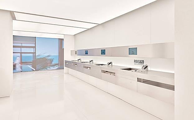 Se trata de la única en la que no hay necesidad de tener contacto con ninguno de sus más de 200 empleados, repartidos en 7.700 metros cuadrados. Solo hay que tener descargada la aplicación de Zara en el móvil para hacer uso del denominado 'Modo tienda', con el que se puede localizar por cuenta propia las prendas que se necesiten mediante un mapa del establecimiento; reservar uno de los enormes y elegantes probadores que hay instalados en todas las plantas -solo la primera planta tiene 28 espaciosas cabinas-; pasar por una caja de autocobro al estilo supermercado, y desalarmar cada una de las piezas adquiridas. Aseguran que no habrá vigilancia en estas zonas pero, aviso para los pícaros, si no se escanea el código de compra de un producto, la máquina no permite quitar la alarma correspondiente.