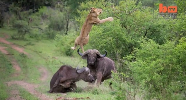En solo 1 minuto y 20 minutos vemos cómo un grupo de leones atacan a un búfalo cuando estaba solo y logran derribarlo. Pero luego aparece otro par de búfalos decididos a proteger a su compañero y los leones huyen. Pero una leona queda agarrada al muslo de un búfalo y es en ese momento cuando uno de ellos la lanza por los aires.