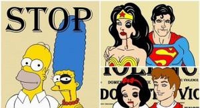 Asimismo, las muestra en escenas directas de violencia: Homer a punto de pegar a una Marge que ya está herida; Superman tapando la boca de Superwoman, y las princesas Disney Blancanieves y Cenicienta desplomadas en el suelo a los pies de sus maltratadores, los respectivos príncipes.