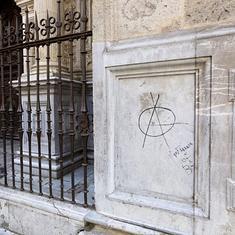 Una vez allí, la patrulla comprobó de que había una pintada en la Puerta del Perdón, una 'A' rodeada en un círculo --como el símbolo de la anarquía-- con una grafía debajo, por lo que se preguntó a los posibles testigos si habían visto al autor. Las personas preguntadas dieron una descripción del graffitero, que fue interceptado en la calle Oficios, donde reconoció a los agentes haber realizado la pintada.