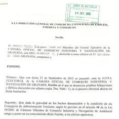 La reclamación presentada por dos miembros del comité ejecutivo de la Cámara de Comercio, Industria y Navegación de Granada por supuesto delito electoral de dos ... de los candidatos a las vocalías de los distintos epígrafes ya está en poder de la Junta de Andalucía. El mismo escrito fue presentado ayer en Sevilla en la Dirección General de Comercio de la Consejería de Empleo, Empresa y Comercio para que la administración andaluza tome cartas en el asunto. En la exposición se advierte de la «gravedad de los hechos denunciados» y de que la consejería ostenta la condición «administración tutelante», según el artículo 48 de la Ley 10/2001 de Cámaras Oficiales de Comercio, Industria y Navegación d Andalucía. El documento hace referencia a la reclamación presentada ante la junta electoral «en el que se denuncian posibles infracciones y delitos electorales en el proceso abierto» en la institución cameral.