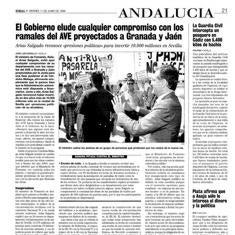 Junio 1999: El Ministerio de Fomento publica el estudio del AVE a Málaga, en el que no aparecen ramales con Jaén y Granada. La Junta de Andalucía se compromete a financiar la conexión al AVE de Granada y Jaén si el Gobierno desiste. De inmediato, el PP asegura que el AVE para Granada lo contempla el Gobierno.