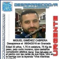 Según informa el Cuerpo en su tuit, Miguel Giménez Cabrera tiene 33 años, mide 1,75 metros y pesa 75 kilos. Tiene el pelo moreno y corto, los ojos castaños, tres tatuajes en el pecho con las caras de sus hijo y otro en la barriga con la leyenda "Vive mientras puedas".