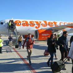 El avión de easyJet ha aterrizado este domingo en el aeropuerto Federico García Lorca inaugurando la conexión con la ciudad italiana