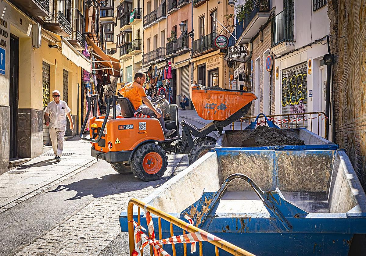 Subir a la Alhambra por Cuesta Gomérez es algo parecido a un recorrido de obstáculos desde hace meses. El reloj apenas marca las 10.00 ... horas de una mañana de verano y, pese al calor, los visitantes se echan a las calles de la ciudad para aprovechar el día. Grupos de amigos o familias con hijos pasean por la zona mientras esquivan cada una de las trabas que se encuentran a su paso. Dos contenedores de escombros y una obra en un edificio justo en frente han invadido las aceras y reducen al mínimo el espacio que los vehículos tienen para circular. El panorama empeora cuando el trenecito turístico desciende por esta misma calle. Los visitantes pegan su cuerpo a la pared y ven cómo el vehículo circula a pocos centímetros de sus pies. Las miradas de desconcierto y sorpresa se mezclan con las de acabar de vivir un pequeño susto.