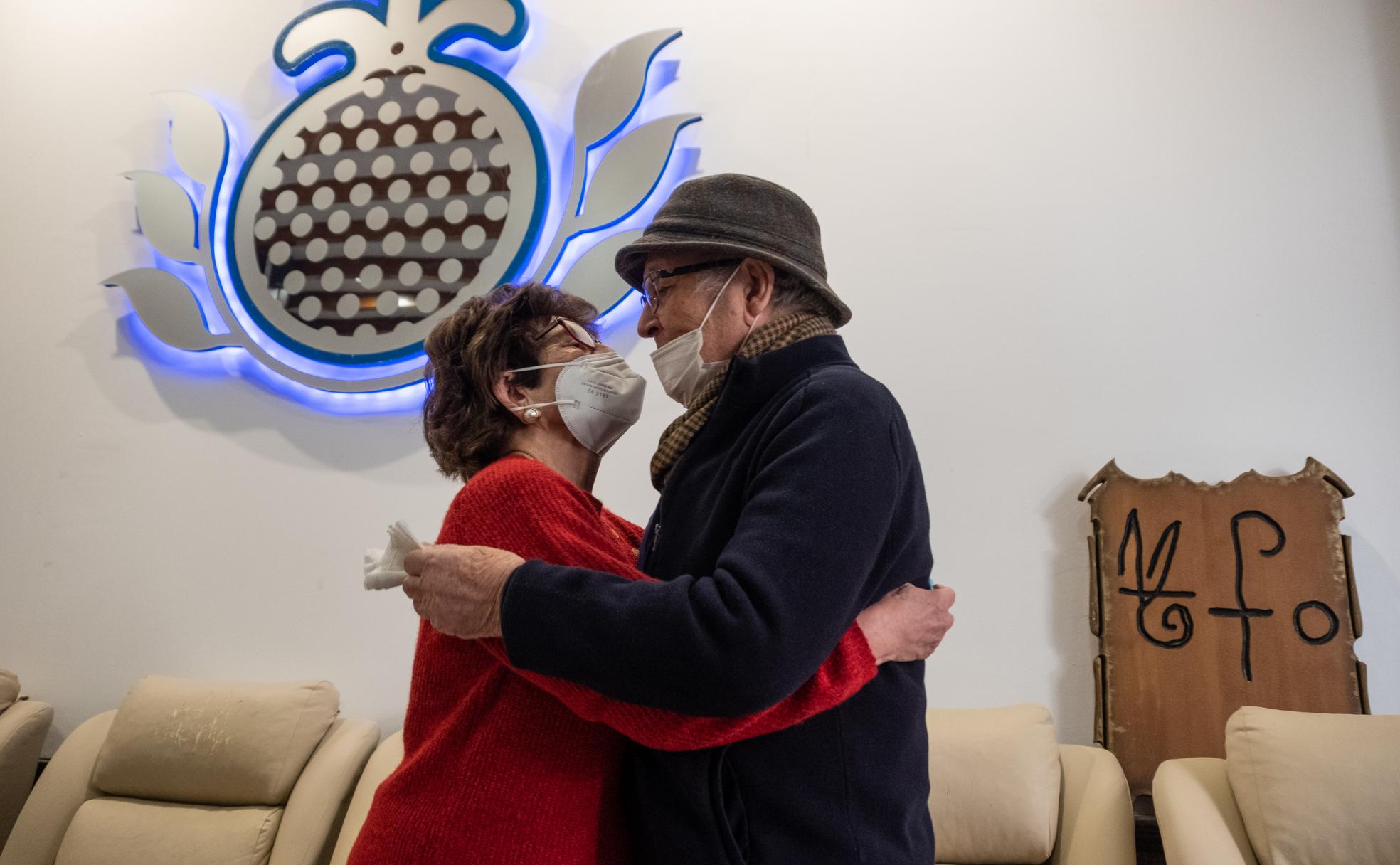 Eulogio entró en la residencia hace siete meses, cuando a su mujer se le hizo imposible seguir cuidándolo -llegó a escaparse y estuvo un día entero perdido en la calle-. «La separación fue muy dura», cuenta ella. No es para menos. Han pasado juntos 57 años de los 83 que llevan en total en este mundo. Va tres veces a la semana a visitarlo, todas las que está permitido. Nunca falta. Al entrar, él abre los brazos. Está deseando arroparla. Se acerca y empieza la sinfonía de piropos. «Ya está aquí mi chica. Estás más guapa que nunca», le dice mientras la besa a través de la mascarilla.