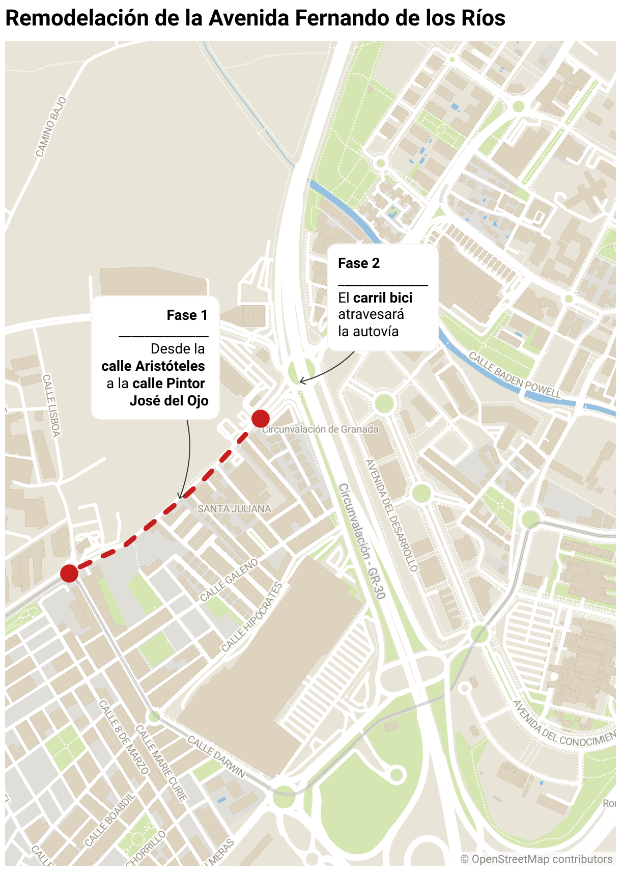 Los trabajos de reforma como tal irán desde la calle Aristóteles a la calle Pintor José del Ojo. Otra parte de la obra será continuar el carril bici por la avenida Fernando de los Ríos, que atraviesa la autovía y al que se le construirá 1,5 kilómetros nuevos para que conecte con un carril ya existente en paralelo a la autovía y que enlaza con el edificio BIC del PTS. Desde ese punto de partida también se podrá recorrer la carretera de Armilla en dirección Parque de las Ciencias.